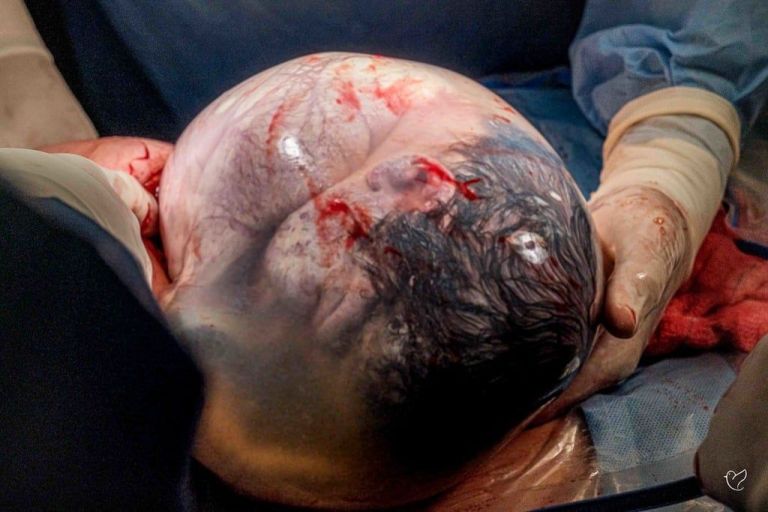 Instante raro: mulher dá à luz gêmeos e um dos bebês nasce empelicado