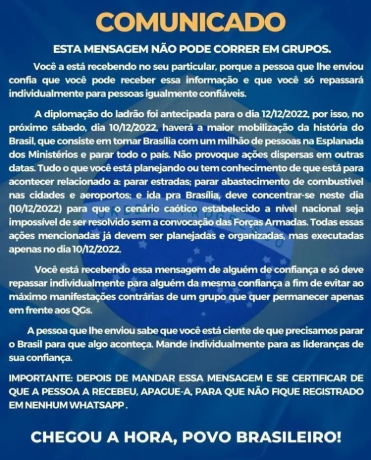 O texto do comunicado estava bem agressivo e com um tom de confronto. A intenção de quem escreveu era clara: “parar todo o país” e ainda forçar a convocação das Forças Armadas. E não para por aí, o autor do comunicado ainda pediu para que ele fosse apagado logo após o recebimento e só fosse compartilhado com “pessoas igualmente confiáveis”, quase como se fosse um segredo de Estado.