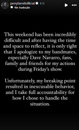 “Esse fim de semana foi um caos total, e eu precisava de um tempo para refletir. Peço desculpas a todos, especialmente ao Dave, fãs, família e amigos, pelo que rolou no palco.”